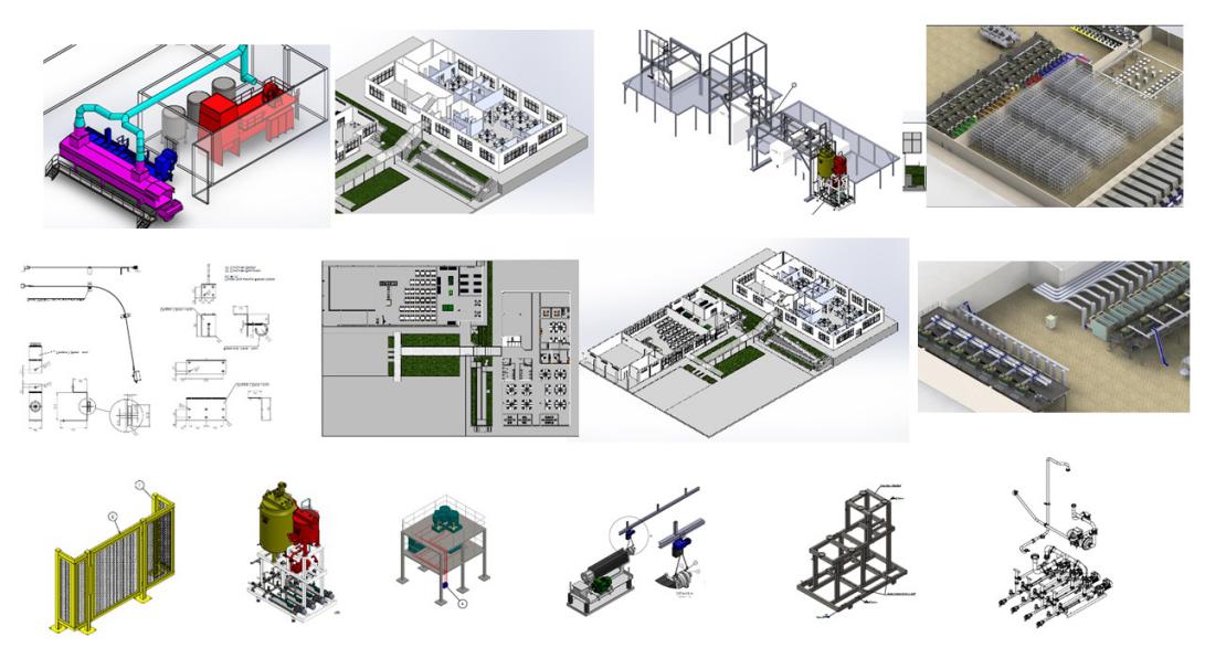 Projetos em 3D de layout industriais, equipamentos e proteções.
